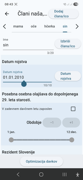 Stran za vnos podatkov o dohodkih družinskih članov omogoča vnos za vsakega člana posebej. Na zgornjem delu zaslona lahko preklapljate med družinskimi člani. Ko izberete člana, se pod imenom pokažejo podatki pomembni za izračun dohodnine.